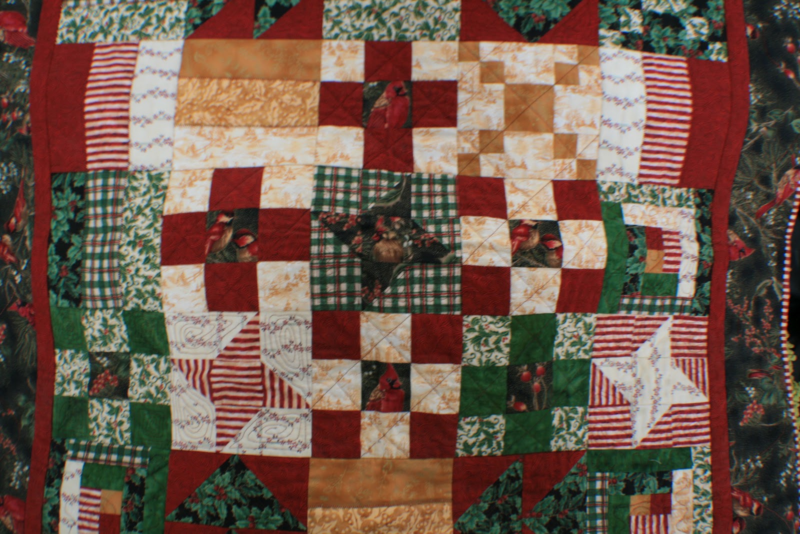 And this was the first quilt I finished. It's actually just a sampler size. Sandy taught me, in her beginning quilt class, the 2nd time I took it. Yes, I took it twice. The first time I took it we made something different, that was harder and I haven't finished it yet (but I will). The second time, I knew how to quilt, but my dear friend Wanda wanted to learn so I took it again with her. Love this sampler. I hang it over the back of an antique church chair at Christmas.